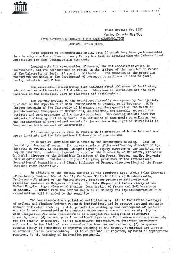 The “constitutive conference” (as it was called following the French terminology) was held at Unesco headquarters in Paris on 18-19 December 1957. Its minutes (“Compte rendu” in French) can be found in various archives but no pictures of this event have been retained even in Unesco’s photo library. However, we have the testimony of Hifzi Topuz – one of few surviving members of the founding conference. As reported by Topuz, the conference was opened by Tor Gjesdal, director of Unesco’s Department of Mass Communication, who might be called the godfather of IAMCR. A good summary of the founding conference is given in Unesco’s press release of 23 December 1957, in the two official languages (See original copies by clicking them).