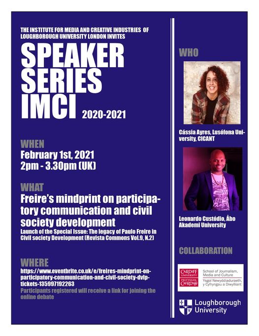 - IMCI Speaker Series: The Institute for Media and Creative Industries at Loughborough University London and the School of Journalism, Media and Culture at Cardiff University invite for the next session of IMCI Speaker Series, February 1st, 2021. Cássia Ayres and Leonardo Custódio will lead us through reflections about the influence of Freire's works in communication and social change initiatives. We will explore the new special issue about Freire's legacy in participatory communication and civil society development recently published by Revista Commons and guest edited by Thomas Tufte, César Jiménez-Martínez and Ana Christina Suzina. The special issue of Revista Commons is available here: https://revistas.uca.es/index.php/cayp/issue/view/432