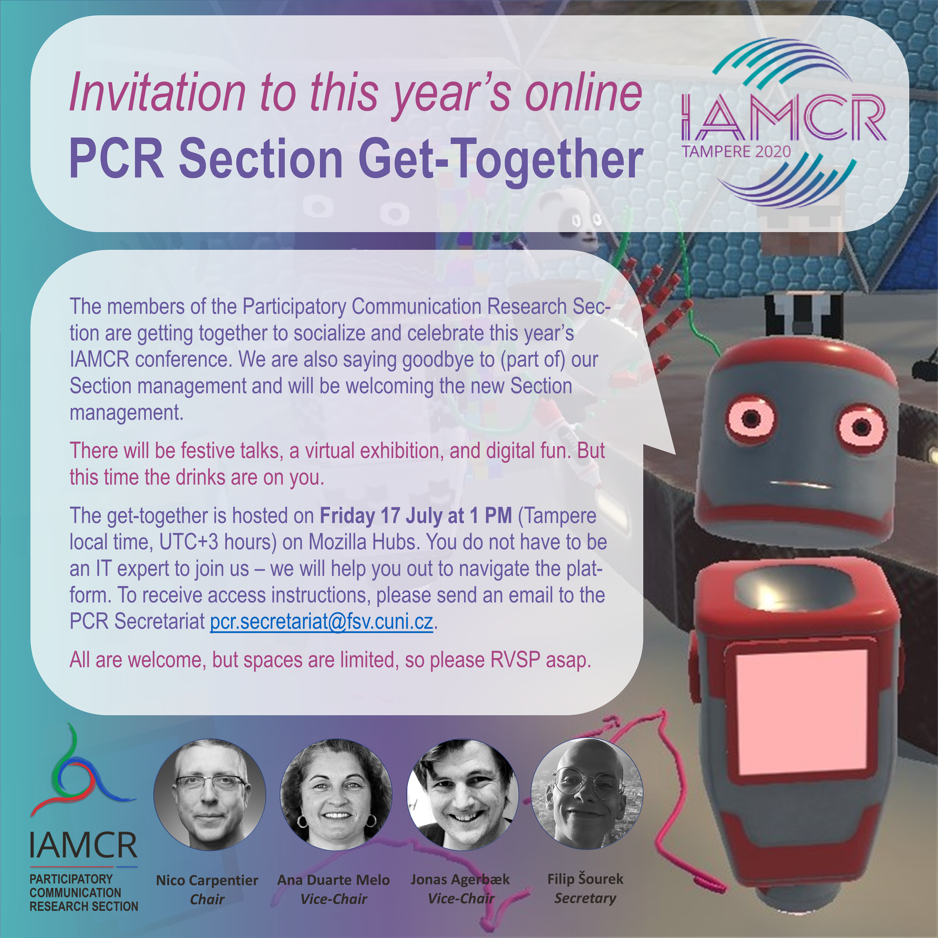 The Participatory Communication Research Section invites its members to for a get-together which is organized with a purpose of socializing and celebrating the IAMCR 2020 conference. The PCR Section will also say goodbye to (a part of) its management and will be welcoming the new Section management.